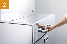 洗浄時間を任意に設定できる自動停止タイマー付き。洗浄運転終了後は、自動的に投入口が上部の定位置に停止します。