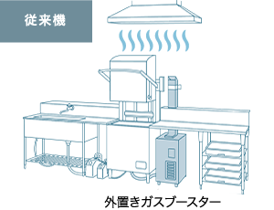 ブースターを洗浄機本体に内蔵することで省スペース化を実現。排気フードが小さくでき、また空いたスペースの有効活用も可能です。