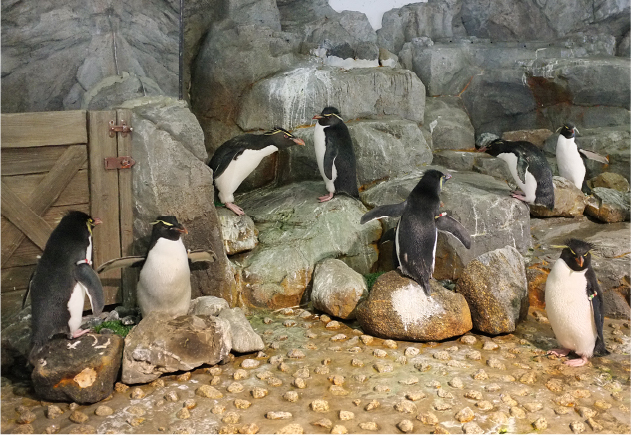 フォークランド諸島水槽にいるイワトビペンギンは「ミナミイワトビペンギン」という種類です。このペンギンは国内飼育羽数が減少傾向にあり、展示が難しくなりつつあります。海遊館では展示水槽と予備水槽の2カ所でペンギンの繁殖に取り組んでいて、展示水槽では岩のあいだに巣を作れる環境を用意しています。また、人工授精に向けた研究も進めています。