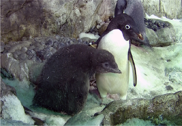 南極大陸水槽は、気温を0℃~3℃、水温を10℃に設定してあります。現在はオウサマ(キング)ペンギンが25羽、ジェンツーペンギンが12羽、アデリーペンギンが9羽と、たくさんのペンギンを飼育しています。水槽内では、演出効果として降雪装置で人工雪を降らせています。また、この水槽内には日本最高齢のジェンツーペンギンが4羽います。まだ繁殖にからんでいるので、これからも大事に飼育していきたいと思っています。