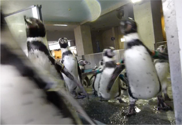 温帯ゾーンの裏には巣小屋が広がっています。野生の温帯ペンギンは巣穴で生活しているので、囲いのある巣を一つひとつ置いています。3種類どれも同じ形をしていて、フンボルトペンギンの場合は数が多いのでたくさん必要です。巣小屋は休む時に使っていますが、なかには自分の居場所として陣取るペンギンもいます。巣がないペンギンは、ときどき戦いに挑むこともありますね。